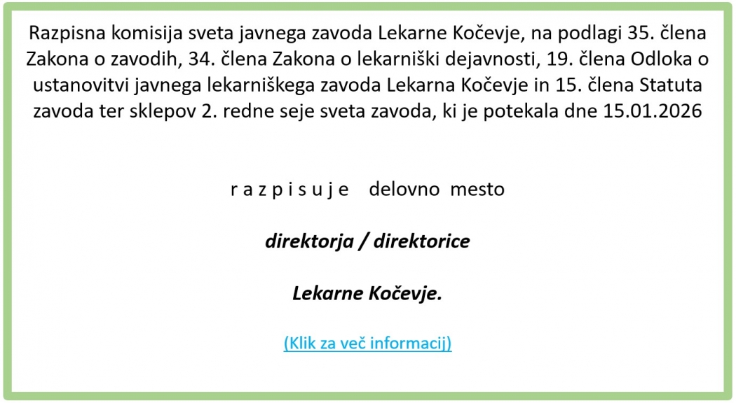 Razpisna komisija sveta javnega zavoda Lekarne Kočevje, na podlagi 35. člena Zakona o zavodih, 34. člena Zakona o lekarniški dejavnosti, 19. člena Odloka o o ustanovitvi javnega lekarniškega zavoda Lekarna Kočevje in 15. člena Statuta zavoda ter sklepov 2. redne seje sveta zavoda, ki je potekala dne 15.01.2026