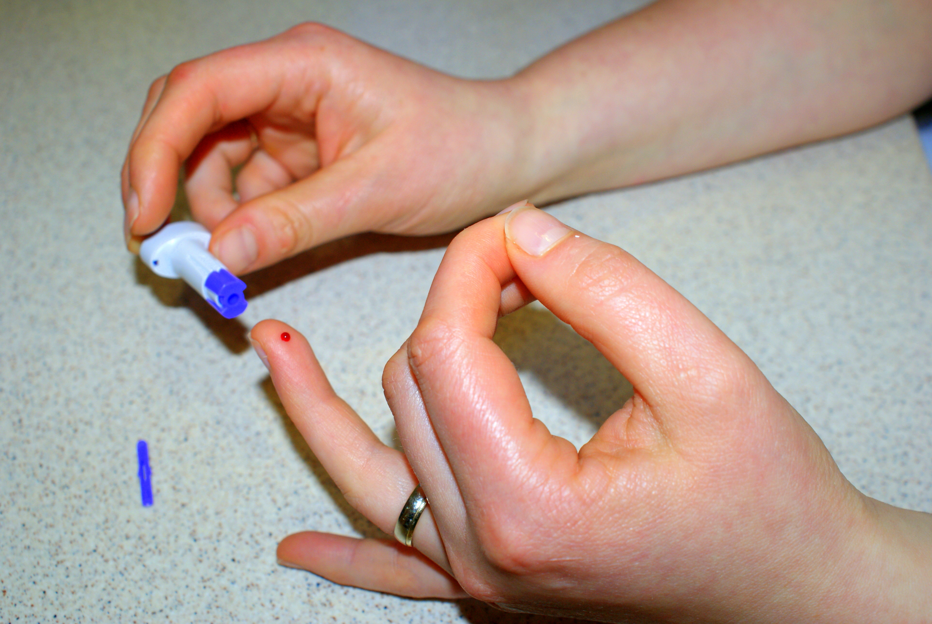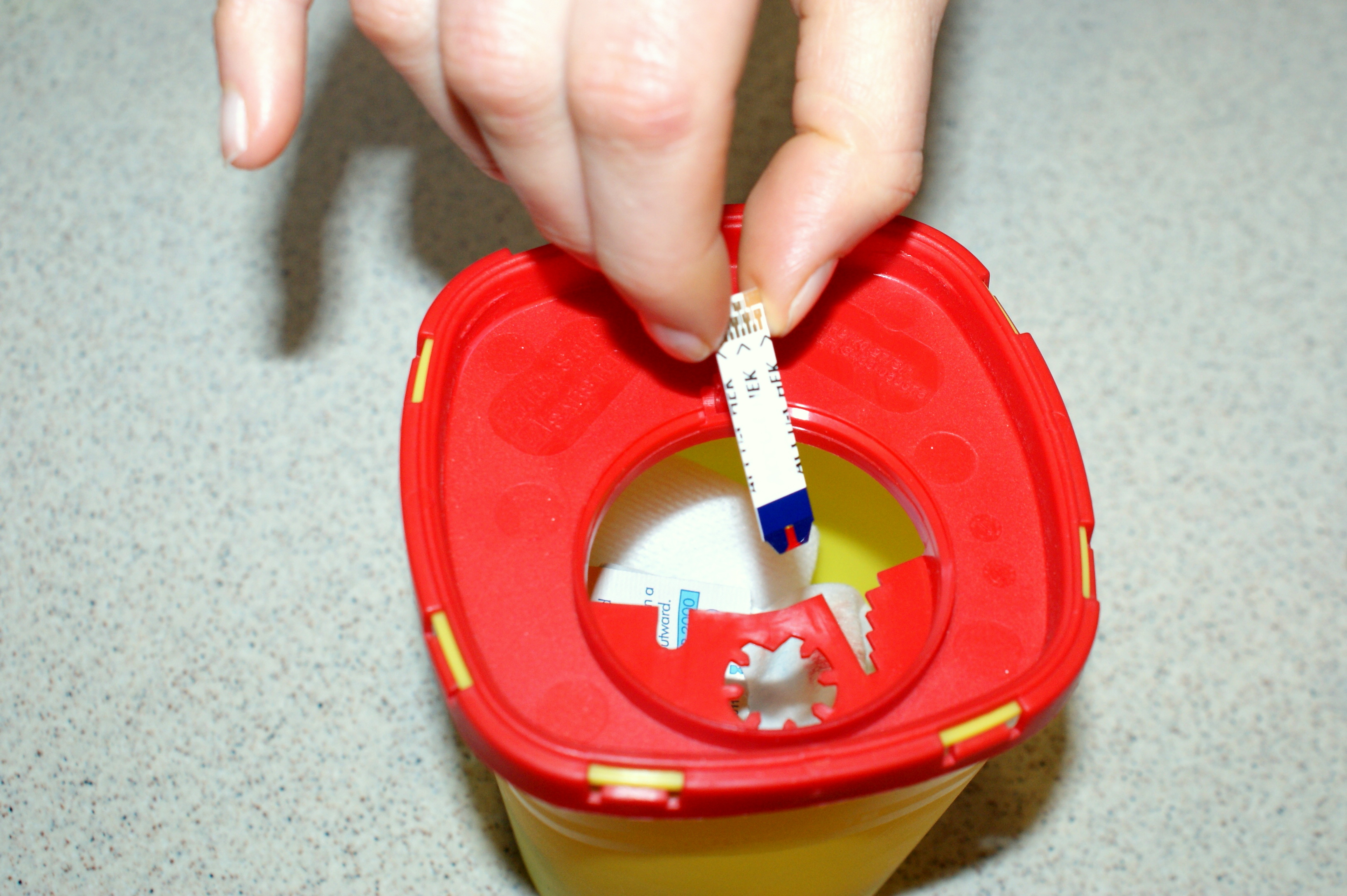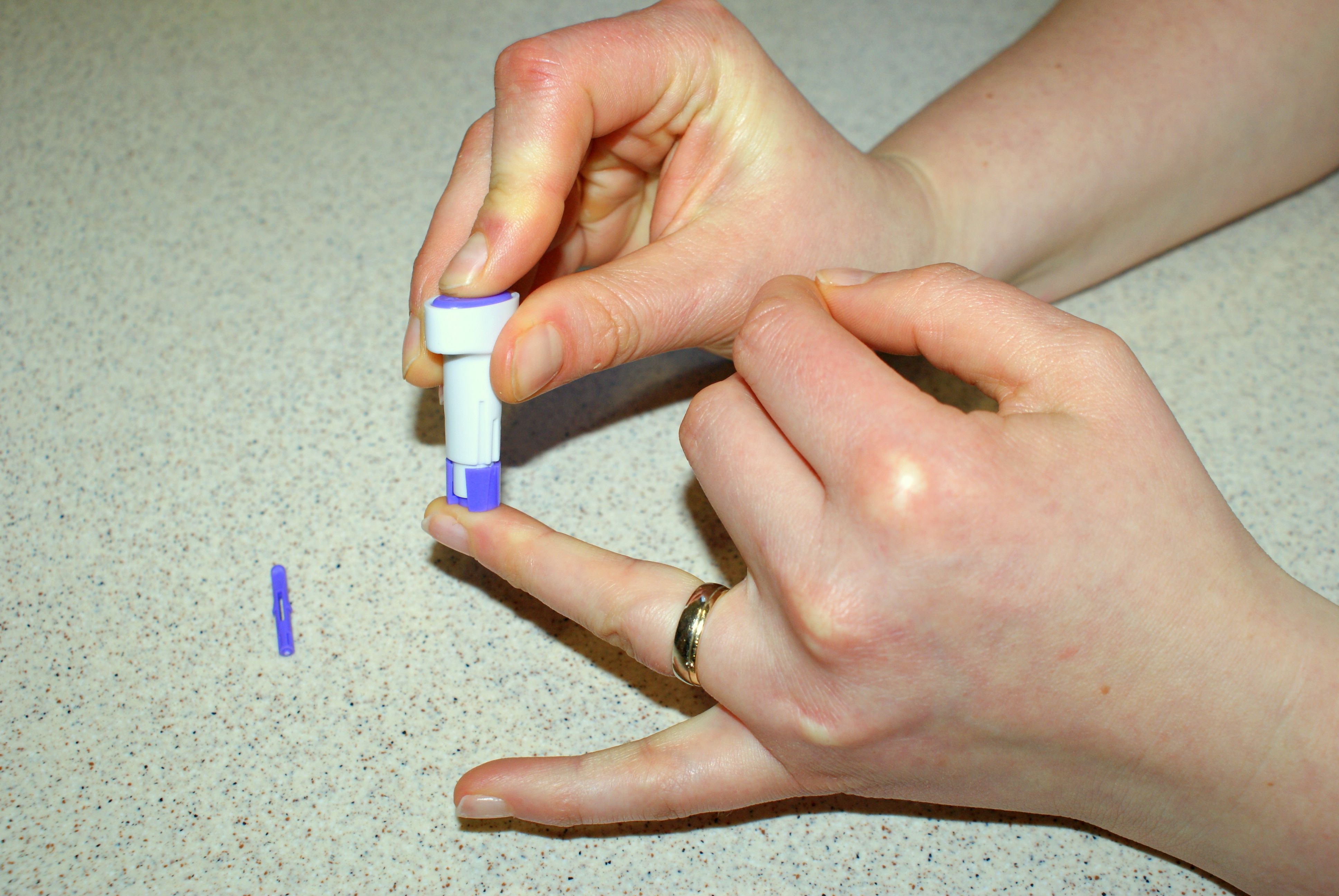 Ko se prst posuši, ponudimo pacientu lanceto, s katero se nato sam vbode. Po končanem vbodu odvrže lanceto v za to namenjen zbralnik. Če je mogoče, naj pacient prvo kapljico odstrani, da tako zmanjša možnost onesnaženja, kar bi lahko vplivalo na točnost meritve. Če je kapljica premajhna, naj si pacient prst nežno masira v smeri od dlani proti konici.