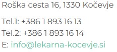 Dežurna služba v Lekarni Kočevje kontakt_lekarna.jpg Ponedeljek 19:00 - 20:00 Torek 19:00 - 20:00 Sreda 19:00 - 20:00 Četrtek 19:00 - 20:00 Petek 19:00 - 20:00 Sobota 17:00 - 19:00 Nedelja 17:00 - 19:00