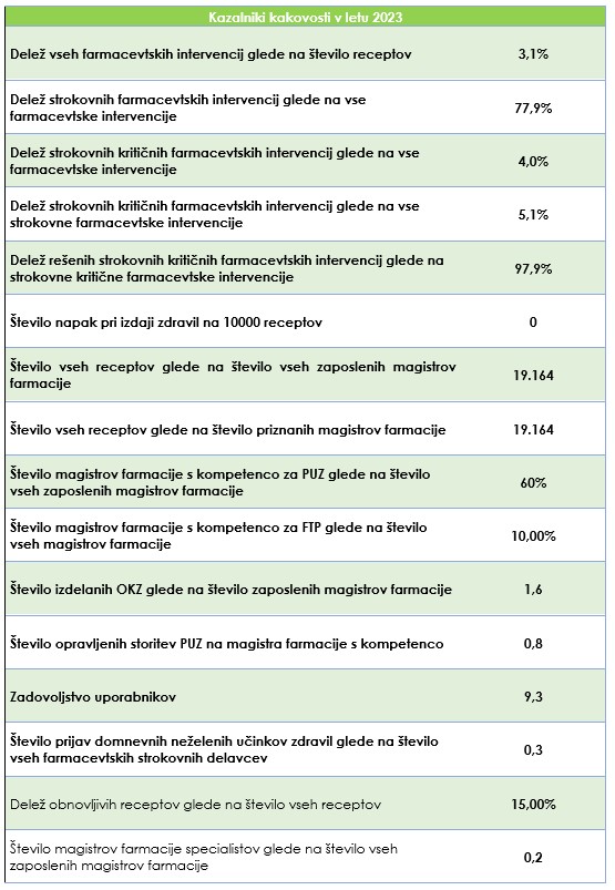 Področje kakovosti in varnosti je v Zakonu o lekarniški dejavnosti (Uradni list RS, št. 85/2016, 77/2017, 73/2019) opredeljeno v III. poglavju. kazalniki_kakovosti_2023.jpg